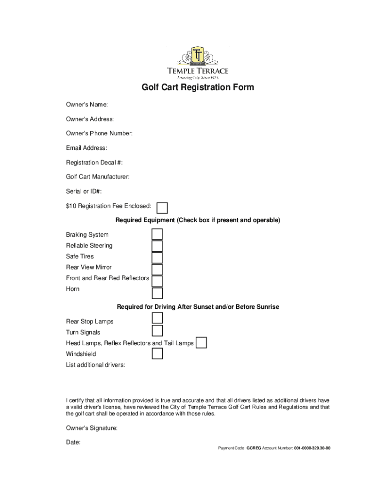 Golf Cart Registration Form Owners Name: Owners Address: Owners Phone Number: Email Address: Registration Decal #: Golf Cart Manufacturer: Serial or ID#: $10 Registration Fee Enclosed: Required Equipment