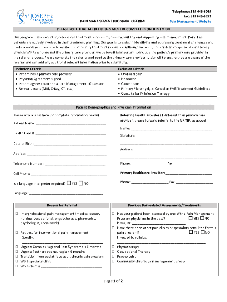 SI Josephs HEALTH CALPAIN MANAGEMENT PROGRAM REFERRALLONDONTelephone: 519 6466019 Fax: 519 6466292 Pain Management WebsitePLEASE NOTE THAT ALL REFERRALS MUST BE COMPLETED ON THIS FORM Our program
