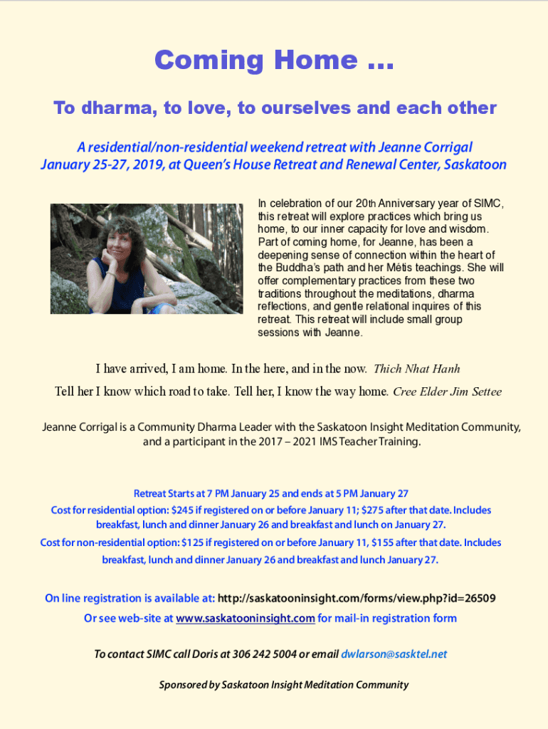 Coming Home To dharma, to love, to ourselves and each other A residential/nonresidential weekend retreat with Jeanne Cortical January 2527, 2019, at Queens House Retreat and Renewal Center, Saskatoon