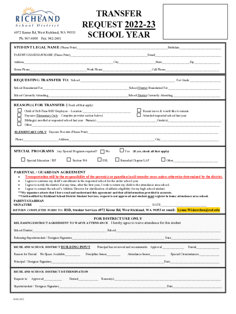 6972 Keen Rd, West Richland, WA 99353 9 79 22TRANSFER REQUEST 202223 SCHOOL YEARSTUDENT LEGAL NAME (Please Print)___Birthdate___ PARENT/GUARDIAN NAME (Please Print)___Email___ Address___City___State___Zip___