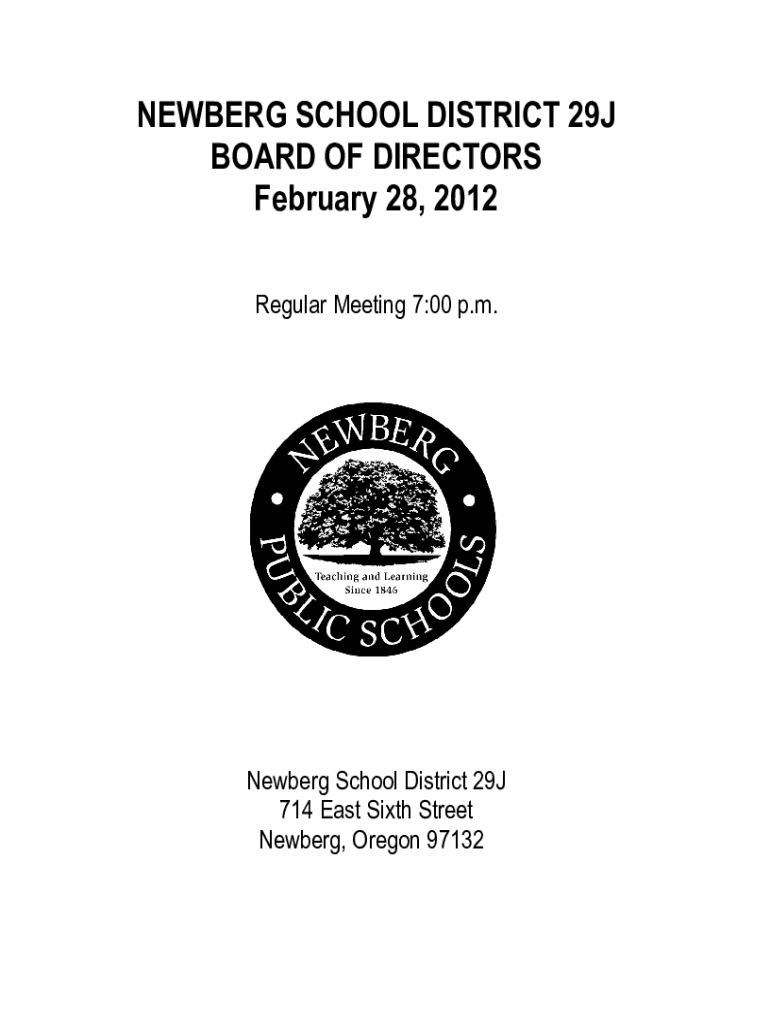 NEWER SCHOOL DISTRICT 29J BOARD OF DIRECTORS February 28, 2012, Regular Meeting 7:00 p.m. New berg School District 29J 714 East Sixth Street New berg, Oregon 97132NEWBERG SCHOOL DISTRICT 29J BOARD