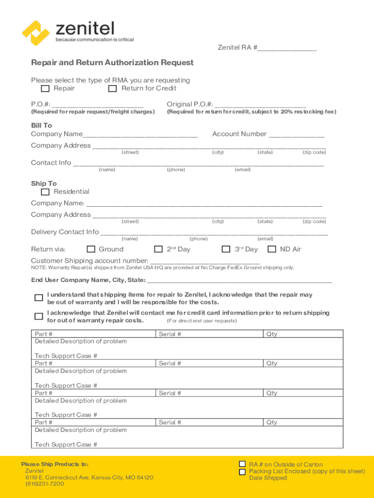 Zenith RA #___Repair and Return Authorization Request Please select the type of RMA you are requesting Repair Return for Credit P.O.#: ___Original P.O.#: ___(Required for repair request/freight charges)(Required