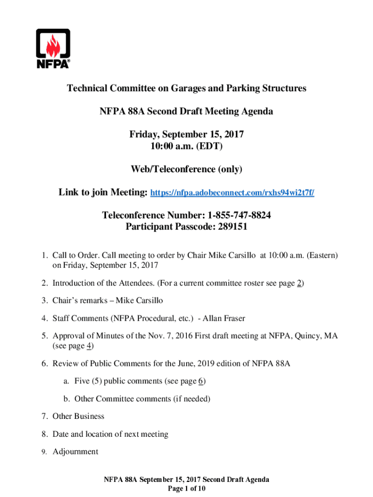 Technical Committee on Garages and Parking Structures NFPA 88A Second Draft Meeting Agenda Friday, September 15, 2017 10:00 a.m. (EDT) Web/Teleconference (only) Link to join Meeting: https://nfpa.adobeconnect.com/rxhs94wi2t7f/