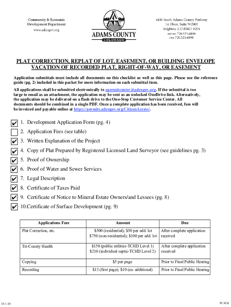 PLAT CORRECTION, REPEAT OF LOT, EASEMENT, OR BUILDING ENVELOPE VACATION OF RECORDED PLAT, RIGHTOFWAY, OR EASEMENT Application submittals must include all documents on this checklist as well as this