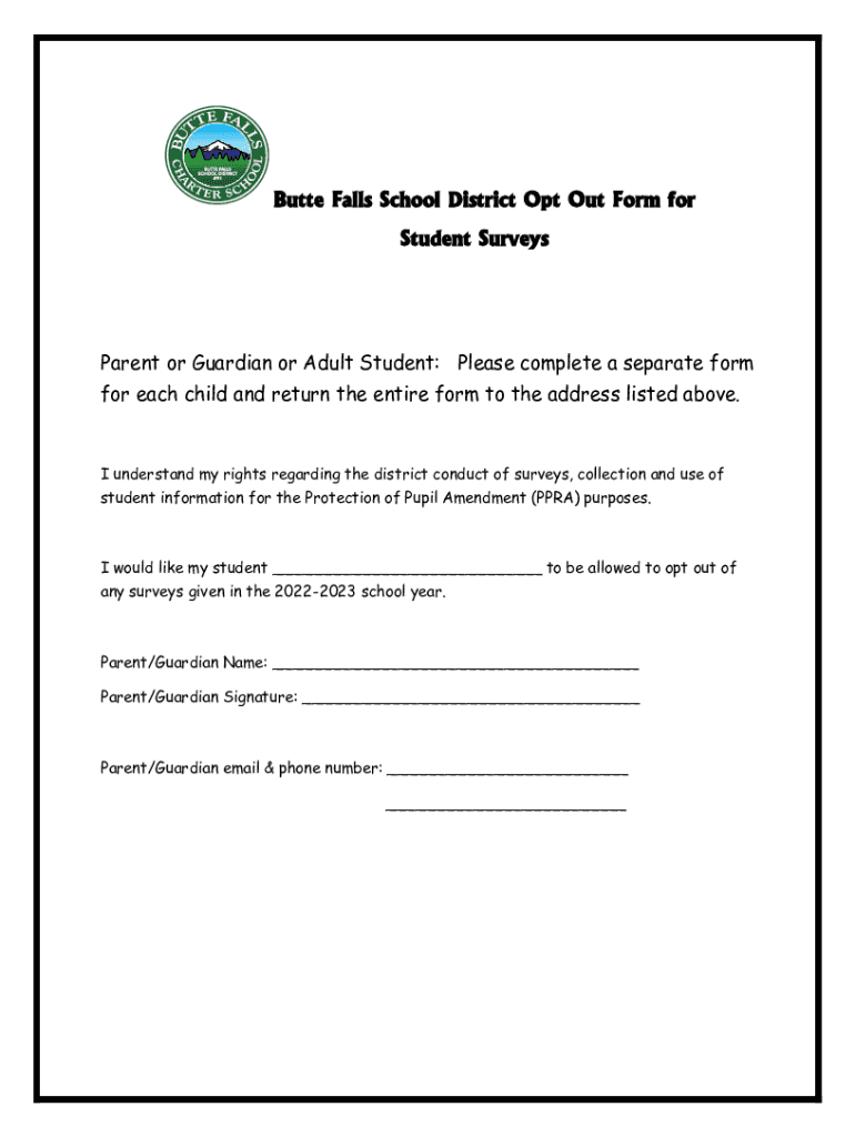 Butte Falls School District Opt-Out Form for Student SurveysParent or Guardian or Adult Student: Please complete a separate form for each child and return the entire form to the address listed above.