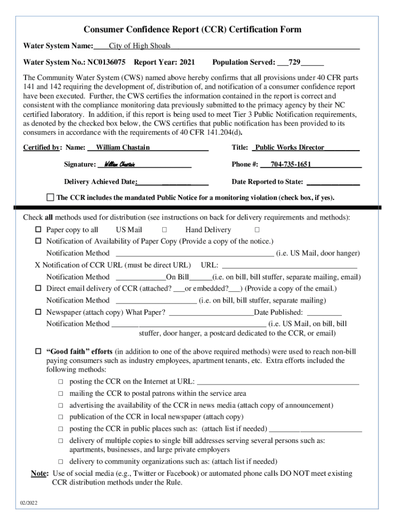 Consumer Confidence Report (CCR) Certification Form Water System Name:___City of High Shoals___ Water System No.: NC0136075Report Year: 2021Population Served: ___729___The Community Water System (CDs)
