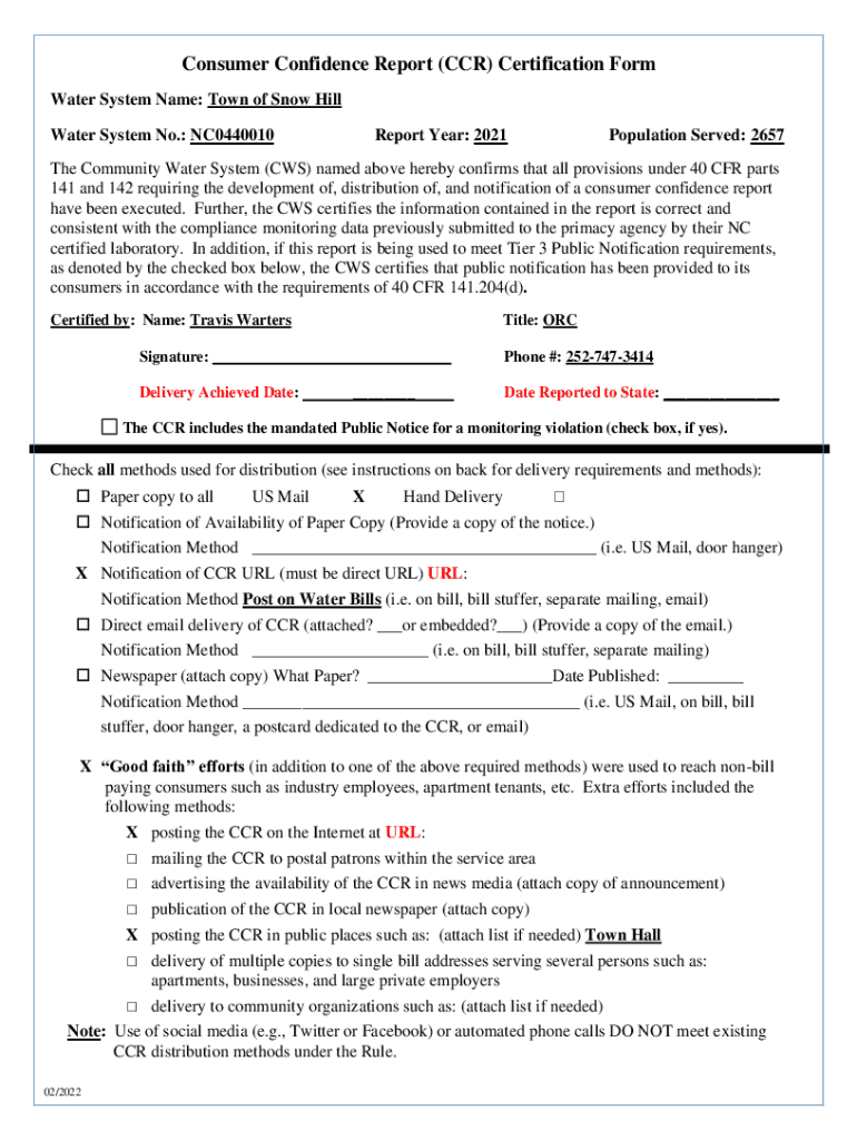 Consumer Confidence Report (CCR) Certification Form Water System Name: Town of Snow Hill Water System No.: NC0440010Report Year: 2021Population Served: 2657The Community Water System (CDs) named above