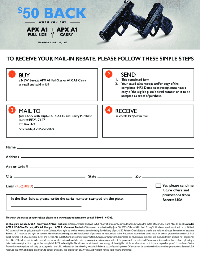 TO RECEIVE YOUR MAILING REBATE, PLEASE FOLLOW THESE SIMPLE STEPS 1BUY2MAIL TO41. 2.a NEW Beretta APX A1 Hillside or APX A1 Carry at retail and paid in full$350 Check with Eligible APX A1 FS and Carry