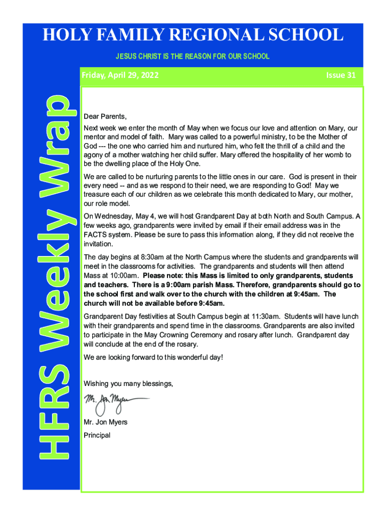 HOLY FAMILY REGIONAL SCHOOL JESUS CHRIST IS THE REASON FOR OUR SCHOOL Friday, April 29, 2022Issue 31Dear Parents, Next week we enter the month of May when we focus our love and attention on Mary,