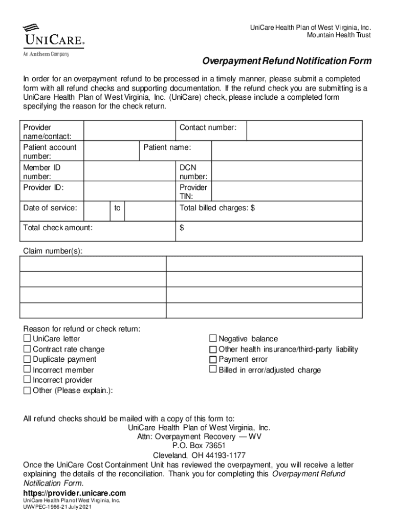 Unifier Health Plan of West Virginia, Inc. Mountain Health TrustOverpayment Refund Notification Form In order for an overpayment refund to be processed in a timely manner, please submit a completed