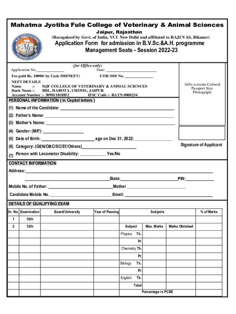 Mahatma Scotia Full College of Veterinary & Animal Sciences Jaipur, Rajasthan (Recognized by Govt. of India, VCI New Delhi and affiliated to CANVAS, Bikaner)Application Form for admission in B.V.