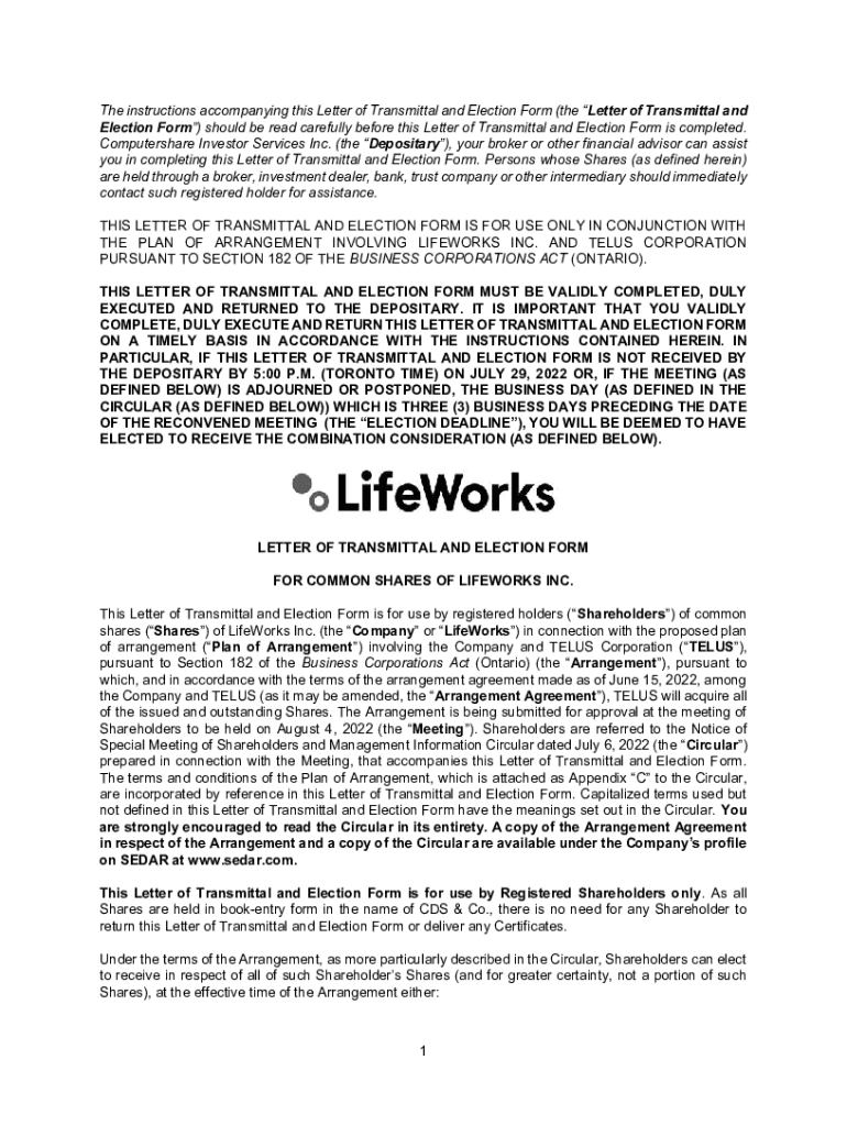 The instructions accompanying this Letter of Transmittal and Election Form (the Letter of Transmittal and Election Form) should be read carefully before this Letter of Transmittal and Election Form