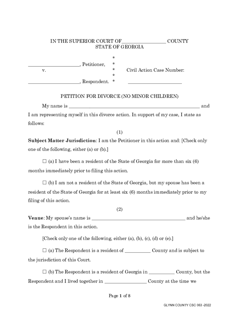 IN THE SUPERIOR COURT OF___ COUNTY STATE OF GEORGIA * * * * ___, Respondent. * ___, Petitioner, v. Civil Action Case Number: ___PETITION FOR DIVORCE (NO MINOR CHILDREN) My name is ___, and I am representing