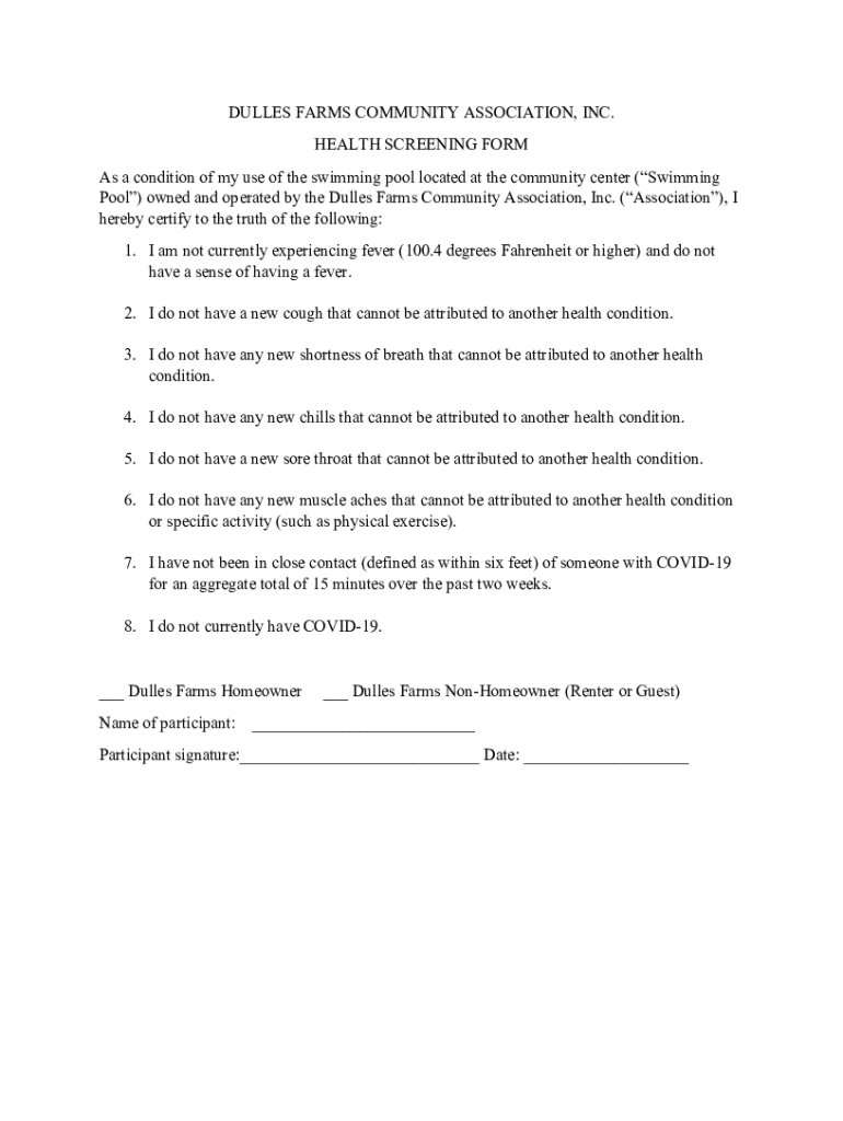 DULLES FARMS COMMUNITY ASSOCIATION, INC. HEALTH SCREENING FORM As a condition of my use of the swimming pool located at the community center (Swimming Pool) owned and operated by the Dulles Farms