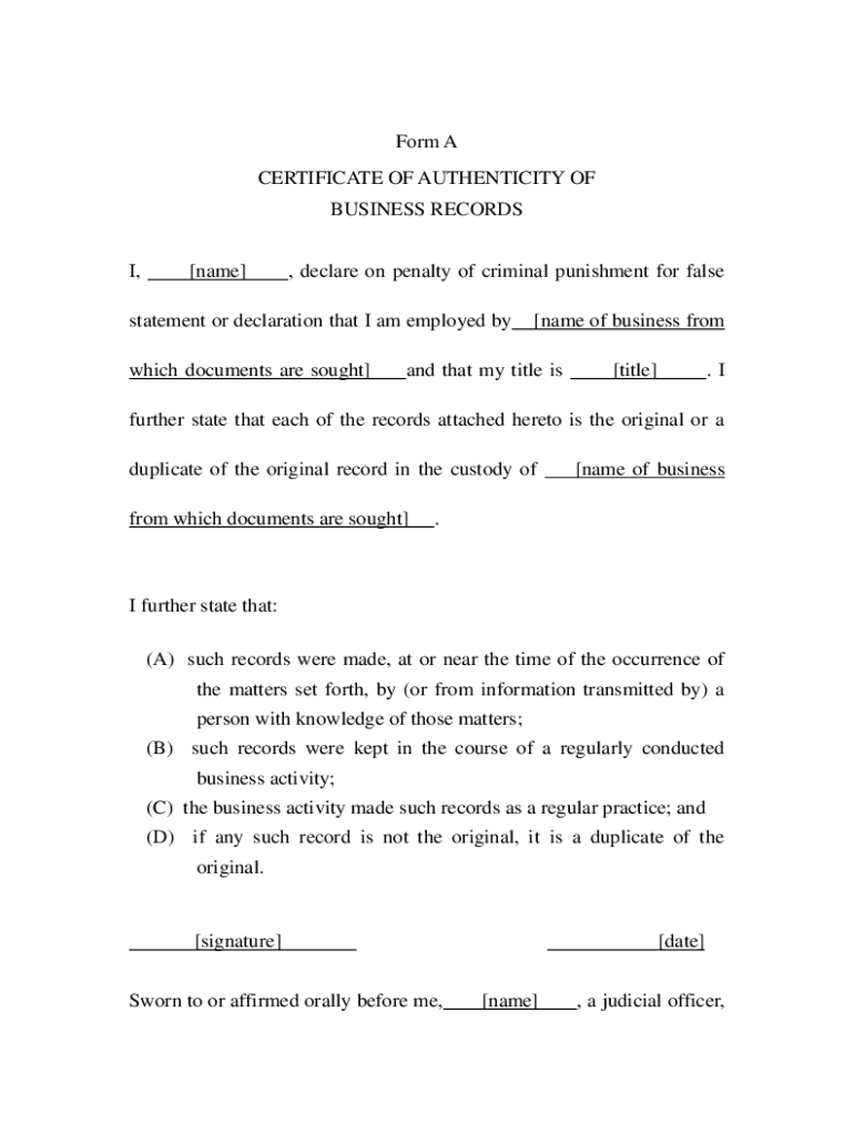 Get the free Form A CERTIFICATE OF AUTHENTICITY OF BUSINESS RECORDS