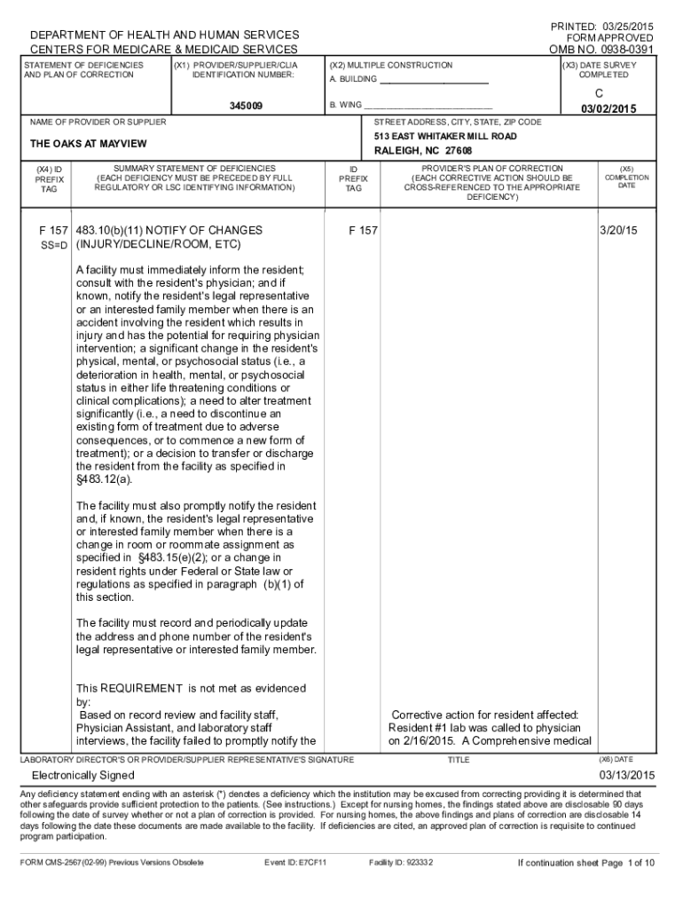 PRINTED: 03/25/2015 FORM APPROVEDDEPARTMENT OF HEALTH AND HUMAN SERVICES CENTERS FOR MEDICARE & MEDICAID SERVICES STATEMENT OF DEFICIENCIES AND PLAN OF CORRECTION(X1) PROVIDER/SUPPLIER/CIA IDENTIFICATION