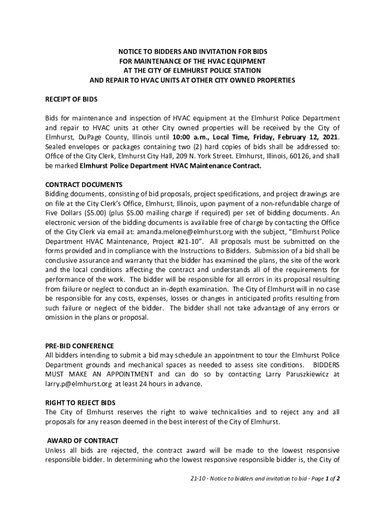 NOTICE TO BIDDERS AND INVITATION FOR BIDS FOR MAINTENANCE OF THE HVAC EQUIPMENT AT THE CITY OF ELMHURST POLICE STATION AND REPAIR TO HVAC UNITS AT OTHER CITY OWNED PROPERTIES RECEIPT OF BIDS for maintenance