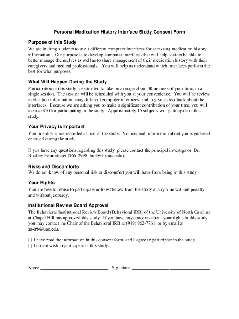 Personal Medication History Interface Study Consent Form Purpose of this Study We are inviting students to use a different computer interfaces for accessing medication history information. Our purpose