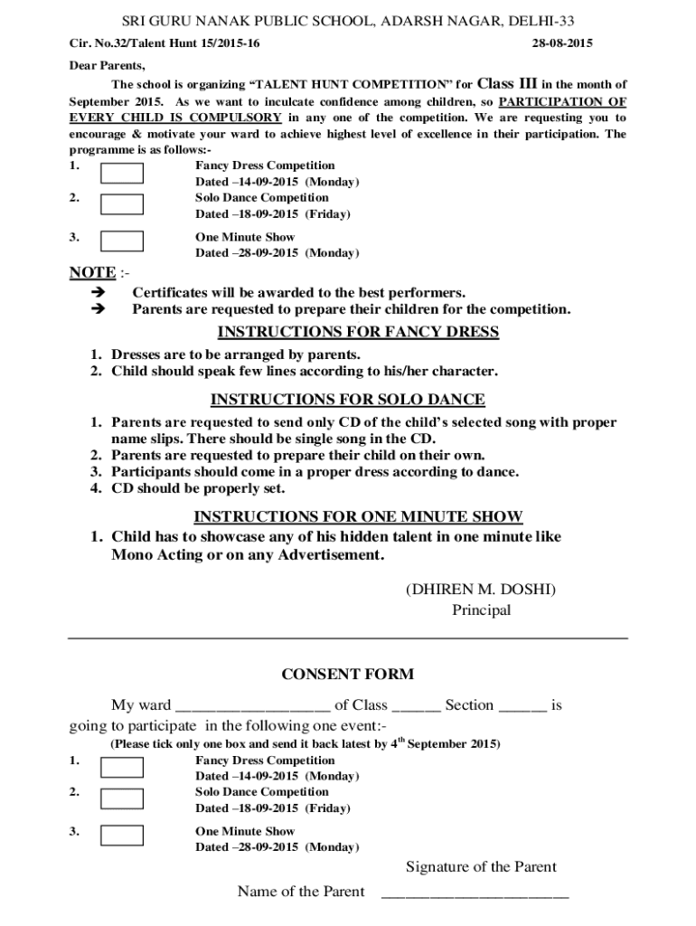 SRI GURU NANAK PUBLIC SCHOOL, ADA RSH NAGAR, DELHI33 Cir. No.32/Talent Hunt 15/20151628082015Dear Parents, The school is organizing TALENT HUNT COMPETITION for Class III in the month of September