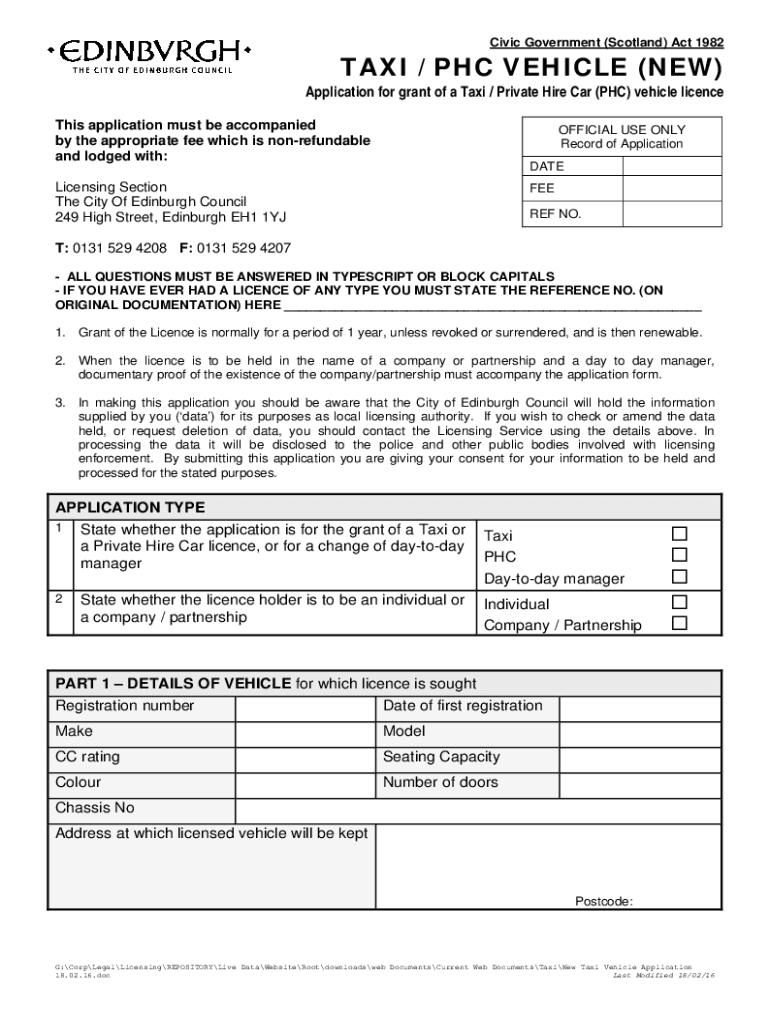 Civic Government (Scotland) Act 1982TAXI / PHC VEHICLE (NEW) Application for grant of a Taxi / Private Hire Car (PHC) vehicle license This application must be accompanied by the appropriate fee which