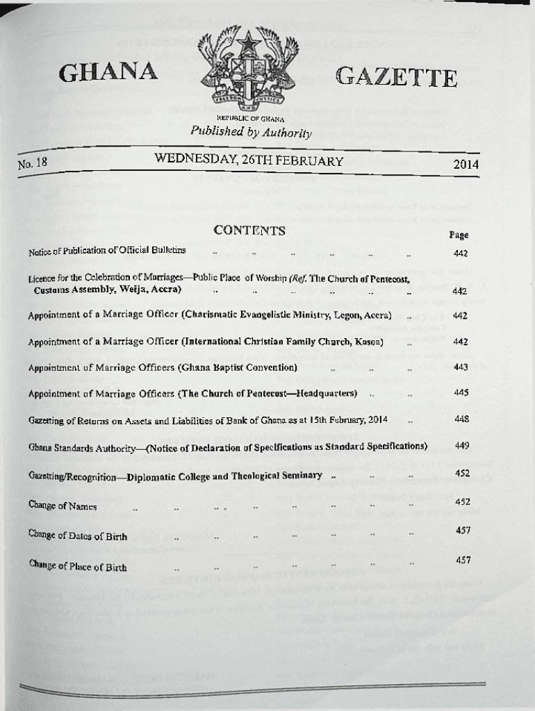 GHANAGAZETTE REPUBLIC OF GHANAPublished by Authority No. WEDNESDAY, 26TH FEBRUARYCONTENTS2014PageNotice of Publication of Official Bulletins442Licence for the Celebration of MarriagesPublic Place