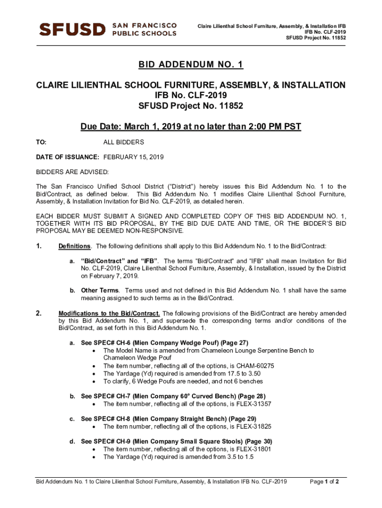 Claire Lilienthal School Furniture, Assembly, & Installation IF No. CLF2019 SF USD Project No. 11852BID ADDENDUM NO. 1 CLAIRE LILIENTHAL SCHOOL FURNITURE, ASSEMBLY, & INSTALLATION IF No. CLF2019 SF