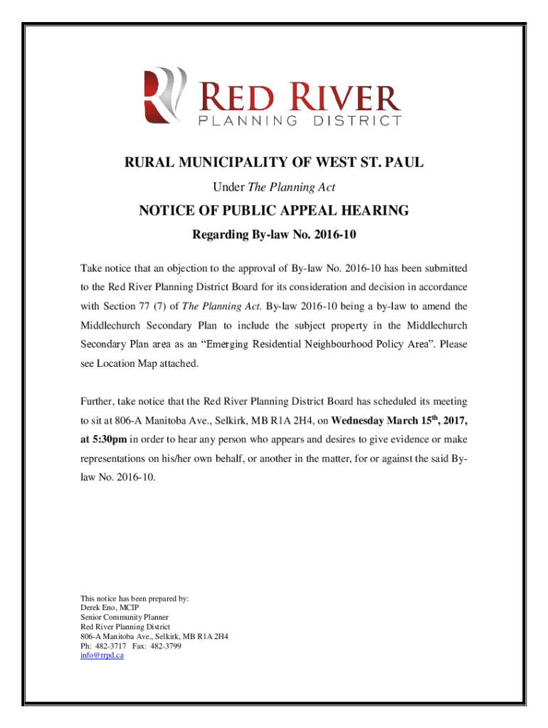 RURAL MUNICIPALITY OF WEST ST. PAUL Under The Planning Notice OF PUBLIC APPEAL HEARING Regarding Bylaw No. 201610 Take notice that an objection to the approval of Bylaw No. 201610 has been submitted