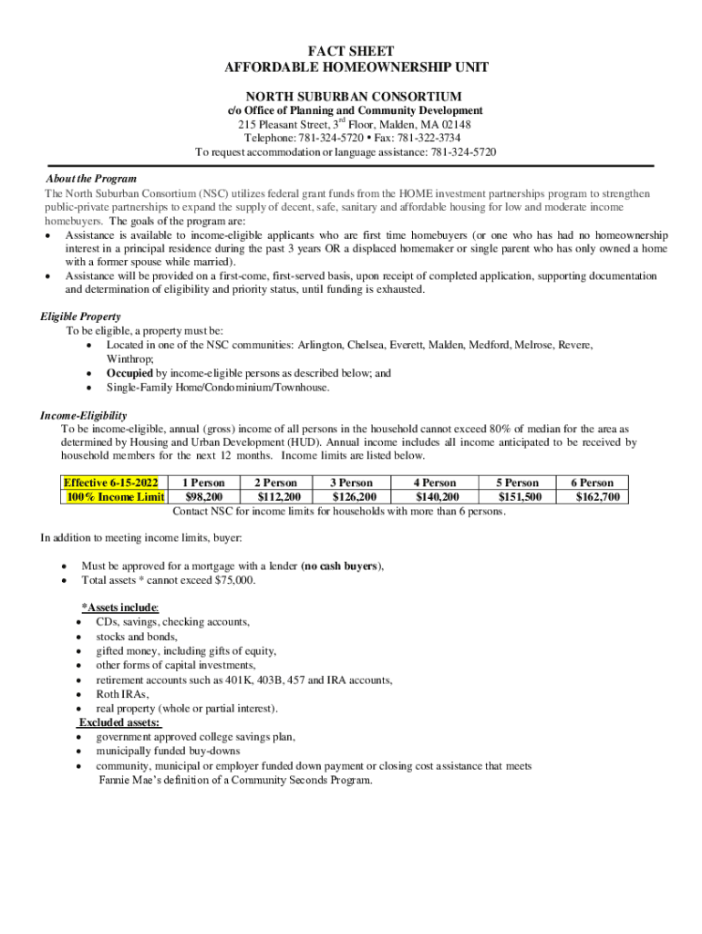 FACT SHEET AFFORDABLE HOMEOWNERSHIP UNIT NORTH SUBURBAN CONSORTIUM c/o Office of Planning and Community Development 215 Pleasant Street, 3rd Floor, Malden, MA 02148 Telephone: 7813245720 Fax: 7813223734
