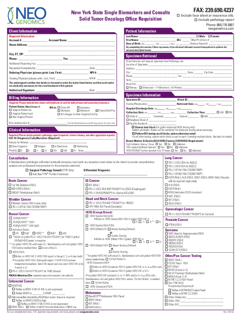 New York State Single Biomarkers and Consults Solid Tumor Oncology Office Requisition Client Informational Name: ___ Male Female First Name:_ ___ M.I.___ Other Pt ID/Acct #: ___ Date of Birth: mm___