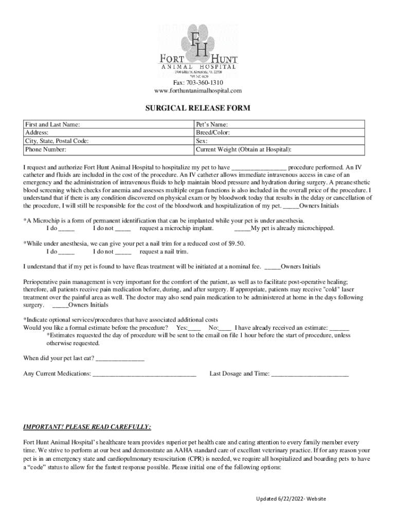 Fax: 7033601310 www.forthuntanimalhospital.comSURGICAL RELEASE FORM First and Last Name: Address: City, State, Postal Code: Phone Number:Pets Name: Breed/Color: Sex: Current Weight (Obtain at Hospital):I