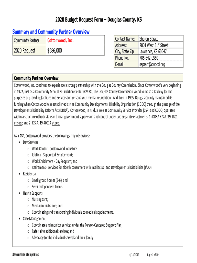 2020 Budget Request Form Douglas County, KS Summary and Community Partner Overview Community Partner:Cottonwood, Inc.2020 Request$686,000Contact Name: Address: City, State Zip Phone No. Email:Sharon