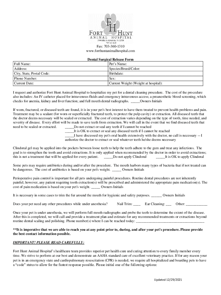 Fax: 7033601310 www.forthuntanimalhospital.comFull Name: Address: City, State, Postal Code: Phone Number: Current Date:Dental Surgical Release Form Pets Name: Species/Breed/Color: Birthdate: Sex:
