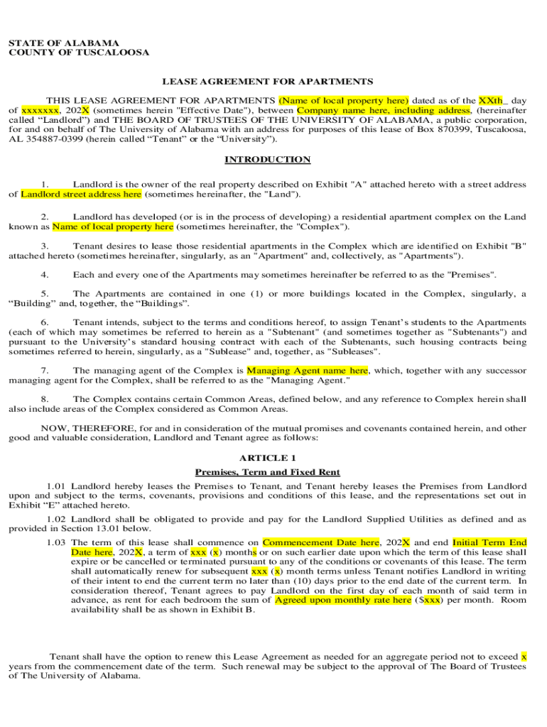 STATE OF ALABAMA COUNTY OF TUSCALOOSA LEASE AGREEMENT FOR APARTMENTS THIS LEASE AGREEMENT FOR APARTMENTS (Name of local property here) dated as of the With_ day of xxxix, 202X (sometimes herein \”