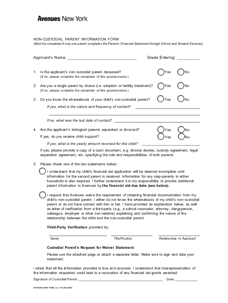 (Must be completed if only one parent completes the Parents Financial Statement through School and Student Services)Applicants Name: ___1. Grade Entering: ___mYesmNomYesmNomYesmNoAre