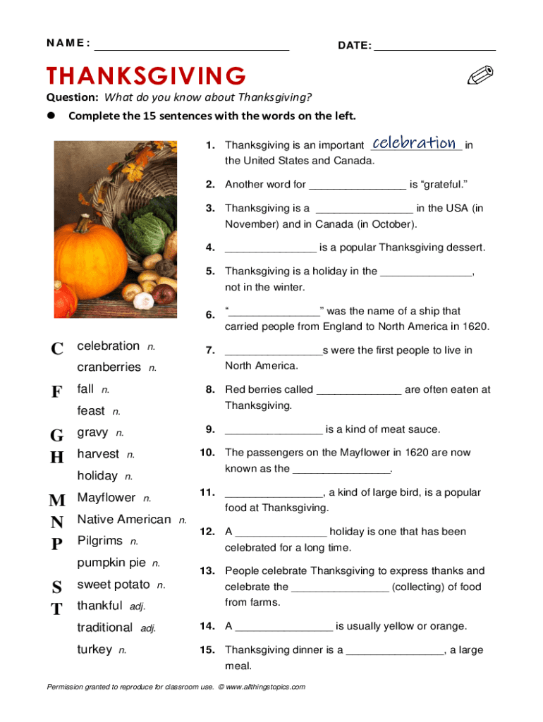 N A M E : ___DATE: ___THANKSGIVING Question: What do you know about Thanksgiving? Complete the 15 sentences with the words on the left. 1. Thanksgiving is an important ___ in the United States and