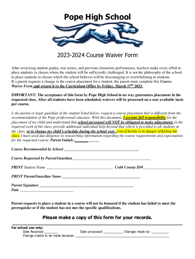 Pope High School20232024 Course Waiver Form After reviewing student grades, test scores, and previous classroom performance, teachers make every effort to place students in classes where the student