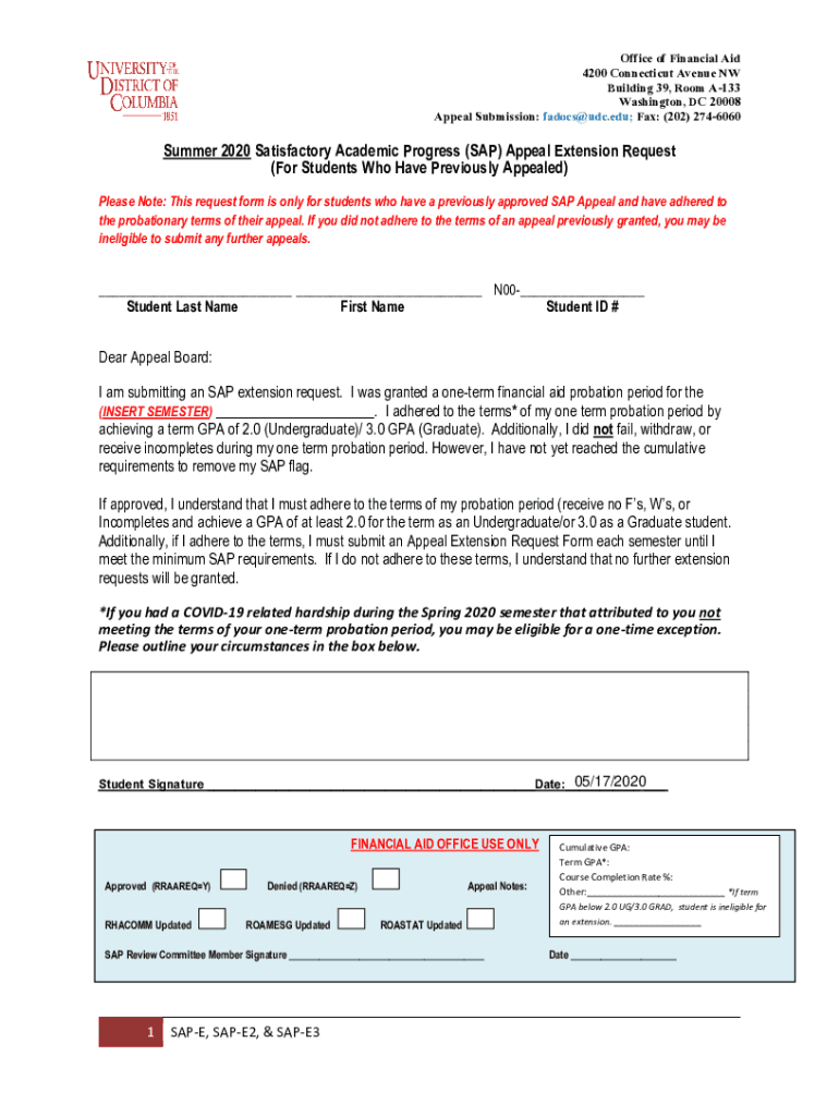 Office of Financial Aid 4200 Connecticut Avenue NW Building 39, Room A133 Washington, DC 20008 Appeal Submission: fadocs@udc.edu; Fax: (202) 2746060Summer 2020 Satisfactory Academic Progress (SAP)