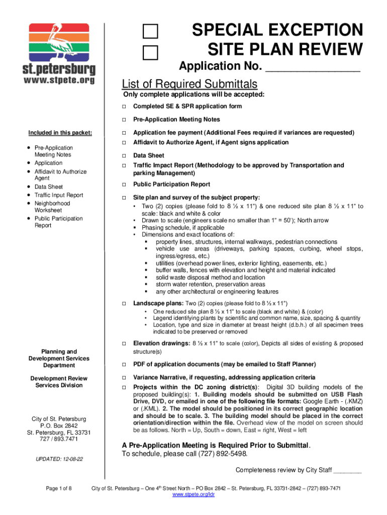 SPECIAL EXCEPTION SITE PLAN REVIEW Application No. ___ List of Required Submittals Only complete applications will be accepted: Completed SE & SPR application form Reapplication Meeting Notes Included
