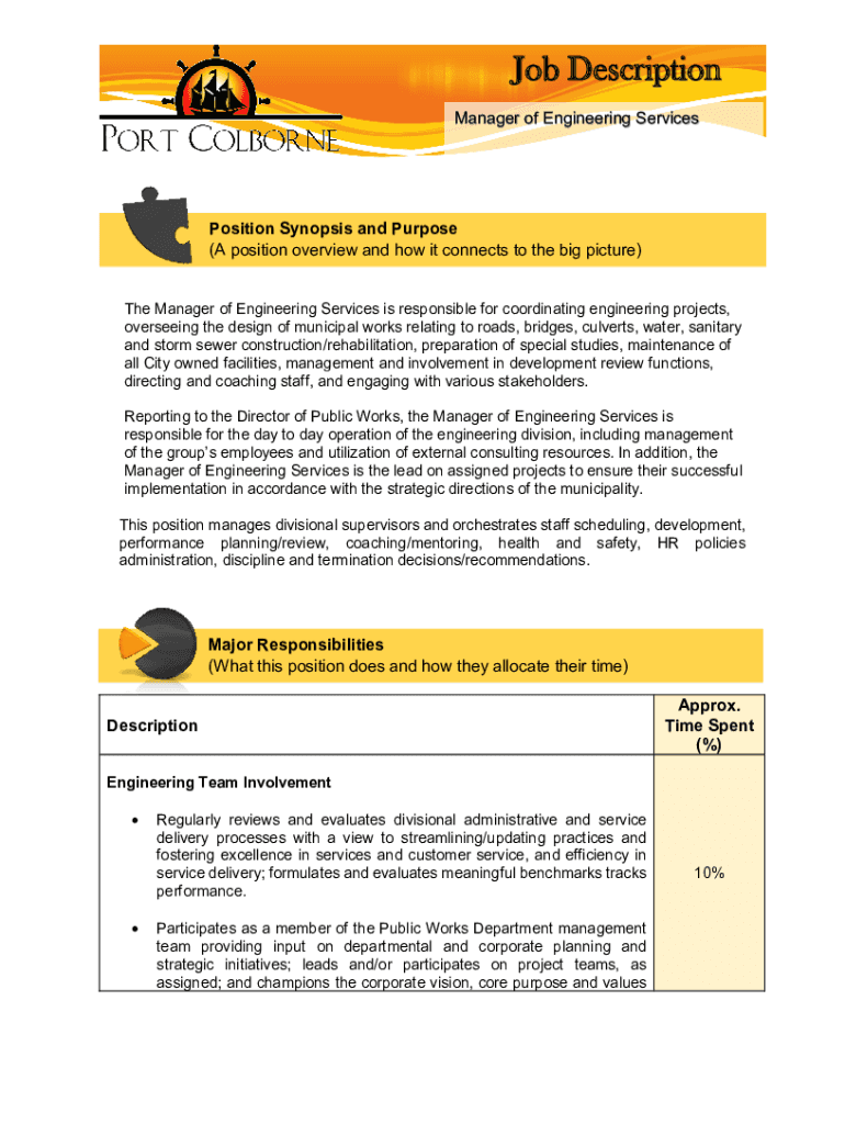 Job Description Manager of Engineering ServicesPosition Synopsis and Purpose (A position overview and how it connects to the big picture) The Manager of Engineering Services is responsible for coordinating