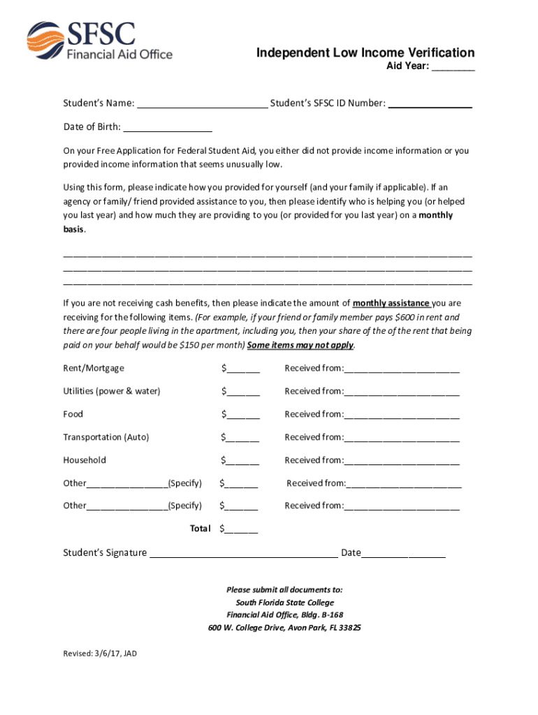 Independent Low Income Verification Aid Year: ___Students Name: ___ Students SFC ID Number: ___ Date of Birth: ___ On your Free Application for Federal Student Aid, you either did not provide income