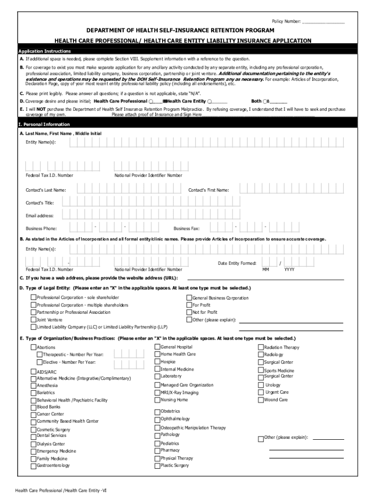 Policy Number: ___DEPARTMENT OF HEALTH REINSURANCE RETENTION PROGRAM HEALTH CARE PROFESSIONAL/ HEALTH CARE ENTITY LIABILITY INSURANCE APPLICATION Instructions A. If additional space is needed, please