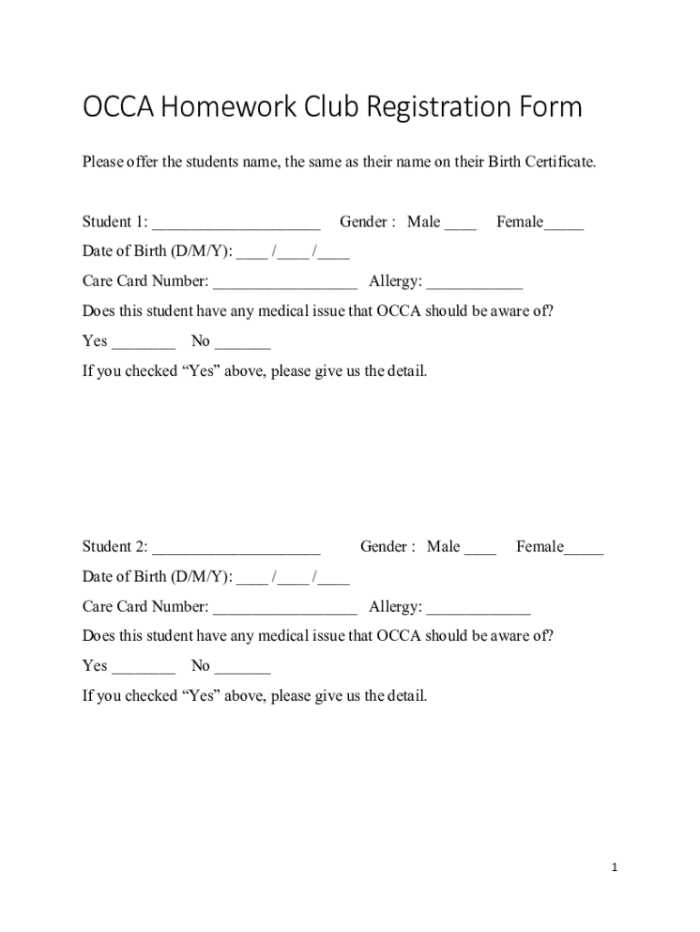 CCA Homework Club Registration Form Please offer the students name, the same as their name on their Birth Certificate. Student 1: ___Gender : Male ___Female___Date of Birth (D/M/Y): ___ /___ /___