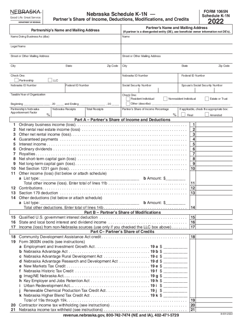 PRINT FORM RESET FORM Nebraska Schedule K1N Partners Share of Income, Deductions, Modifications, and Creditors 1065 N Schedule K1N2022Partners Name and Mailing AddressPartnerships Name and Mailing