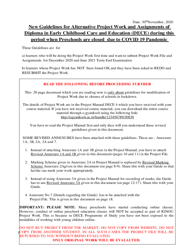 Date: 30thNovember, 2020New Guidelines for Alternative Project Work and Assignments of Diploma in Early Childhood Care and Education (DECK) during this period when Preschools are closed due to COVID-19