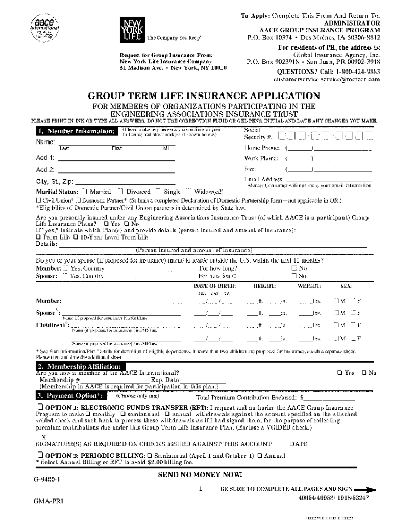 To Apply: Complete This Form And Return To: ADMINISTRATOR RACE GROUP INSURANCE PROGRAM P.O. Box 10374 Des Moines, IA 503068812 For residents of PR, the address is: Global Insurance Agency, Inc. P.O.