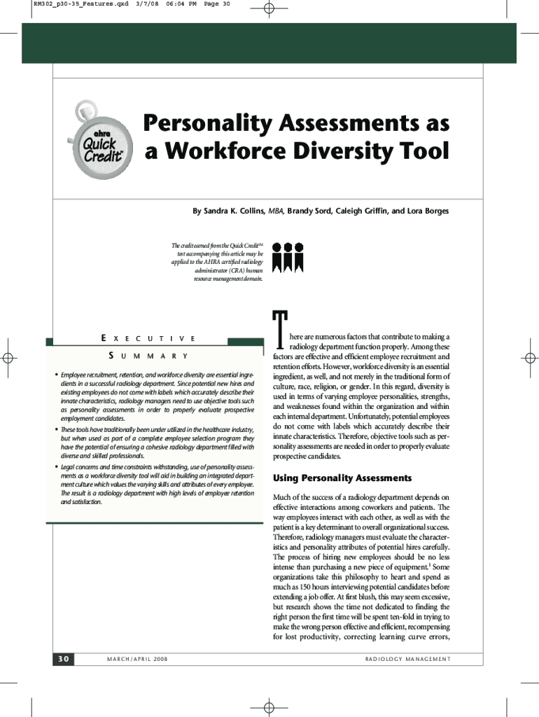 RM302_p3035_Features.qxd3/7/0806:04 PM Page 30Personality Assessments as a Workforce Diversity Tool By Sandra K. Collins, MBA, Brandy Sold, Raleigh Griffin, and Lora Breathe credit earned from the