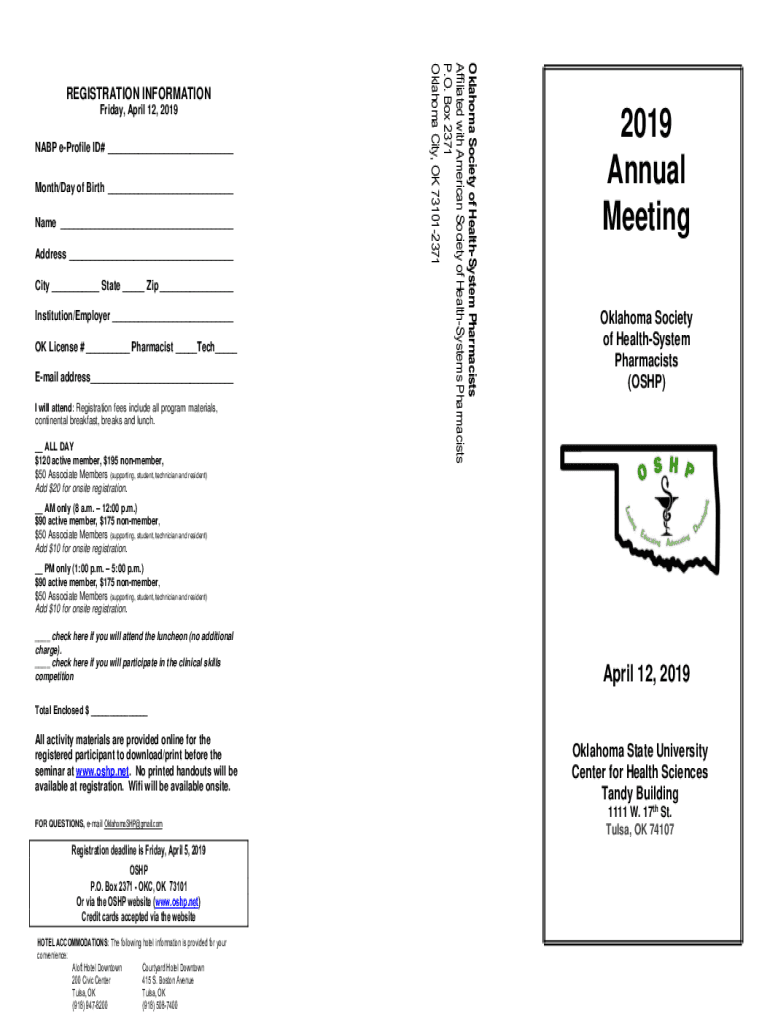 Friday, April 12, 2019, NABP profile ID# ___ Month/Day of Birth ___ Name ___ Address ___ City ___ State ___ Zip ___ Institution/Employer ___ OK License # ___ Pharmacist ___Tech___ Email address ___