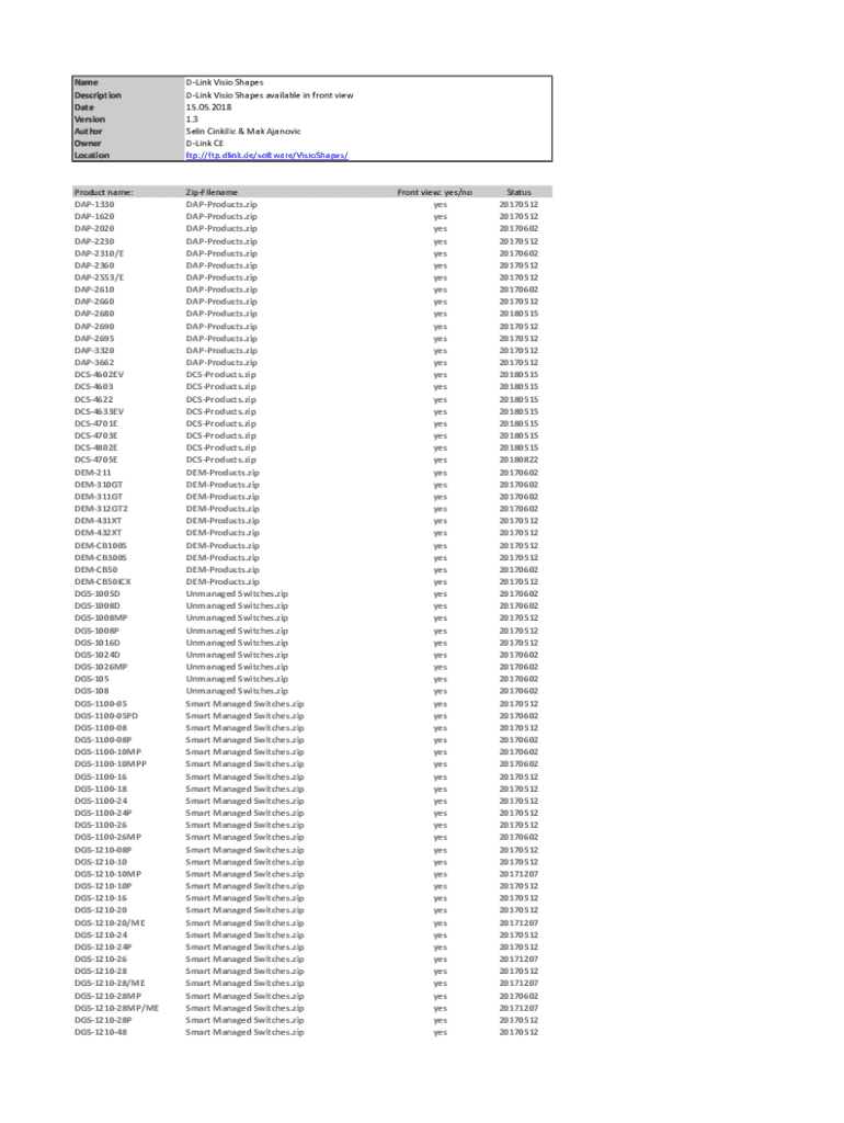 Name Description Date Version Author Owner LocationDLink Vision Shapes Link Vision Shapes available in front view 15.05.2018 1.3 Selim Kinkily & MAK Anatomic Link CE ftp://ftp.dlink.de/software/VisioShapes/Product