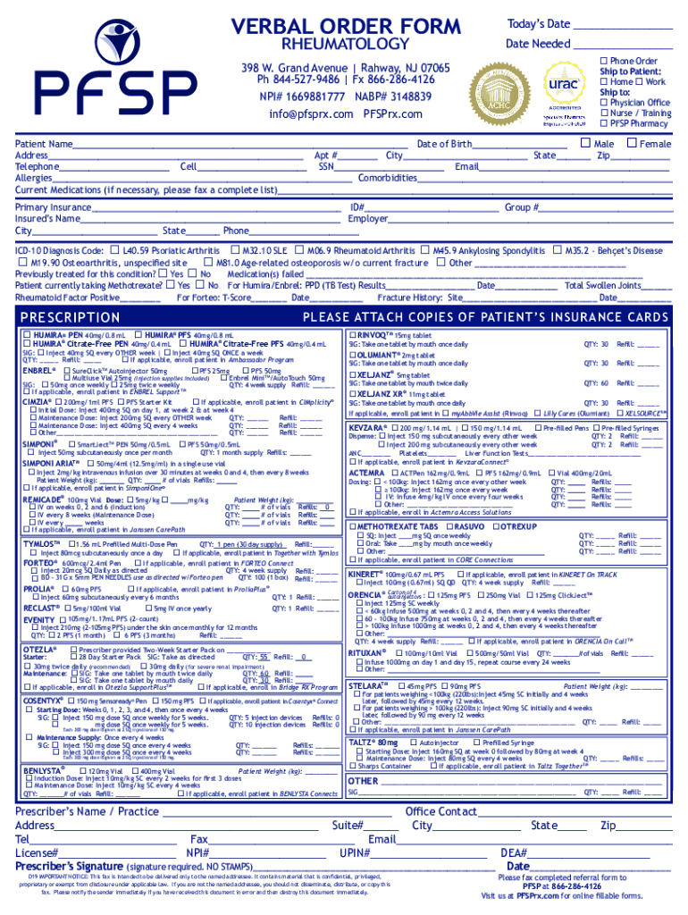VERBAL ORDER FORM RHEUMATOLOGYTodays Date ___ Date Needed ___398 W. Grand Avenue | Rah way, NJ 07065 pH 8445279486 | FX 8662864126 NPI# 1669881777 NABP# 3148839 info@pfsprx.com PFSPrx.com Phone Order