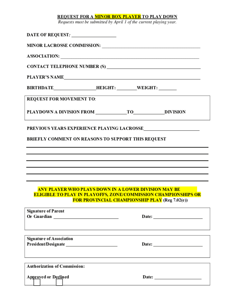PROCEDURES FOR PLAYERS PLAYING DOWN A DIVISION MINOR BOX DIVISION to MINOR BOX DIVISION Requests must be submitted by April 1 of the current playing year. GUIDELINES All players should register and